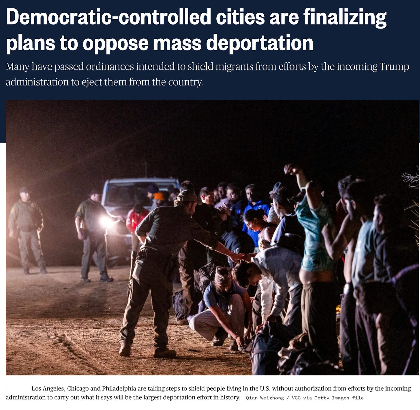 The cities of Los Angeles, Chicago and Philadelphia have vowed to shield people living in the U.S. without authorization from efforts by the incoming Trump administration to carry out what it has said will be the largest deportation effort in history.
