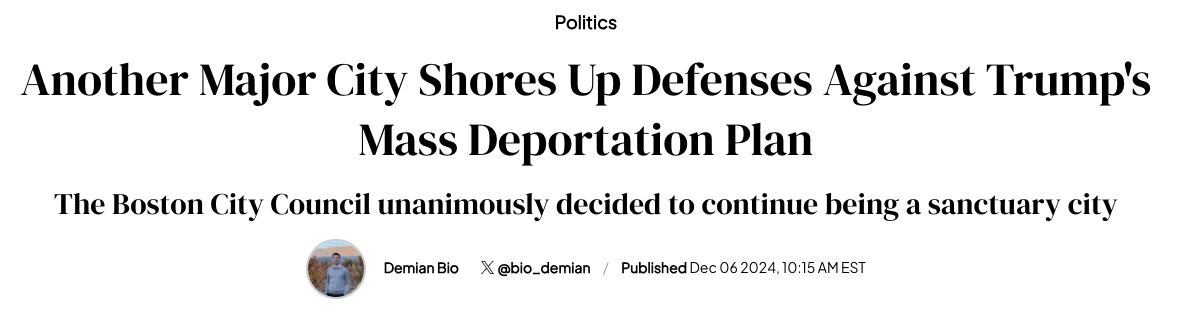 Boston has become the latest city to take steps to shield its immigrant population from President-elect Donald Trump's intended mass deportations: its city council voted unanimously to maintain its status as a sanctuary city, with its Boston Trust Act working to "delineate the distinct roles and responsibilities of the Boston Police Department from those of the U.S. Immigration and Customs Enforcement, thereby promoting trust between local law enforcement and immigrant communities."