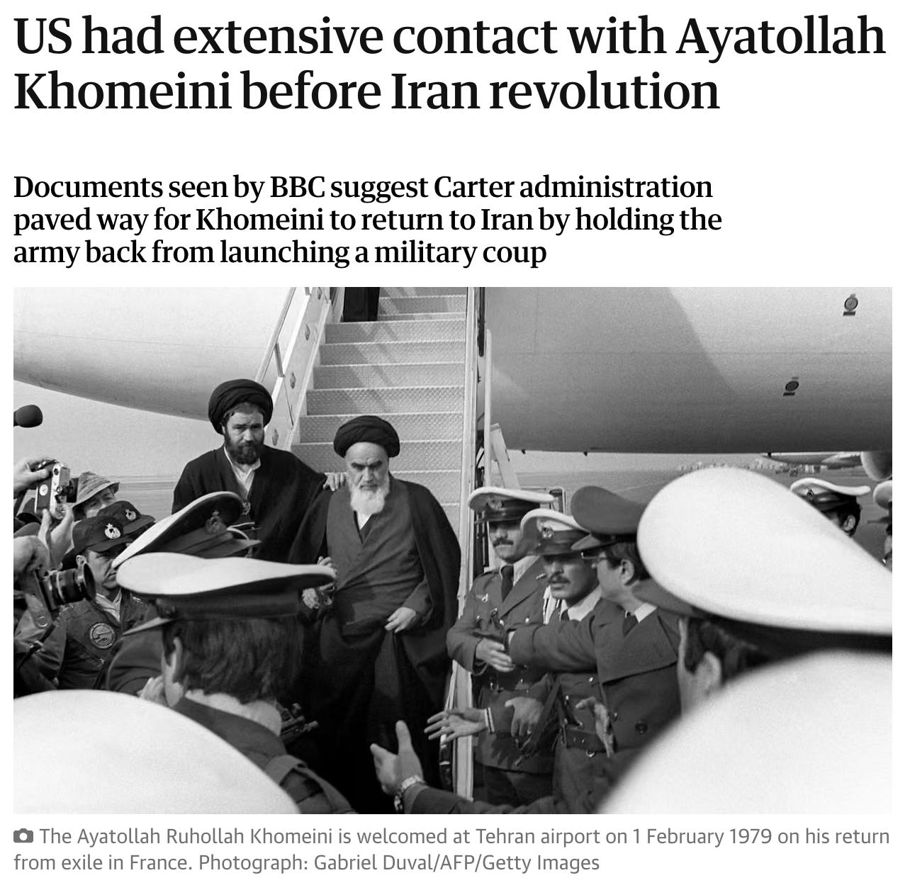 The BBC’s reporting suggests that the Carter administration took heed of Khomeini’s pledges, and in effect paved the way for his return by holding the Iranian army back from launching a military coup.